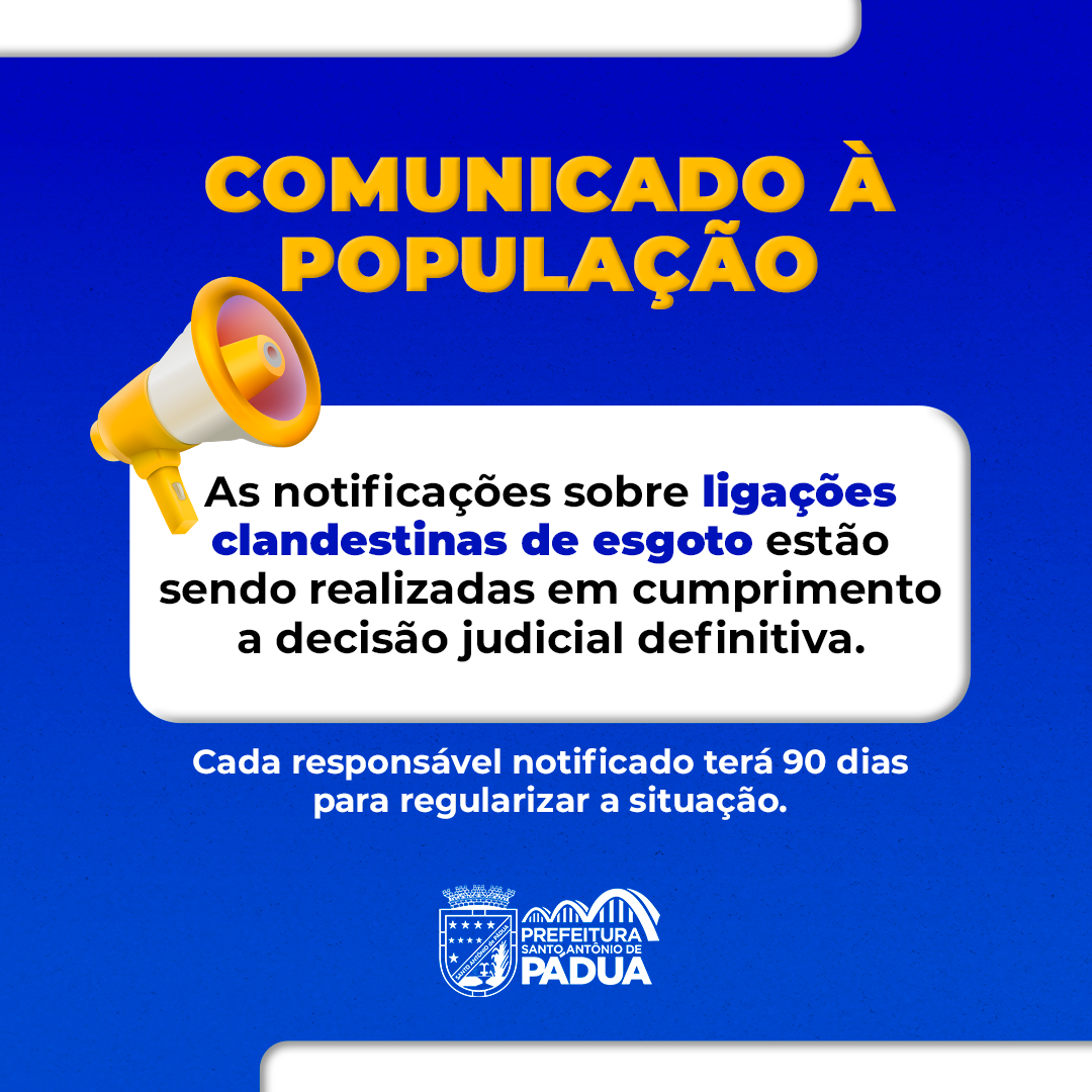 O Município de Santo Antônio de Pádua, por meio de sua Procuradoria, informa à população que as notificações referentes às ligações clandestinas de esgoto estão sendo realizadas em cumprimento a uma decisão judicial definitiva, proferida pela 1ª Vara Federal de Itaperuna em 29 de maio de 2013, no processo nº 0000176-25.2010.4.02.5112. A determinação judicial estabelece que o Muni