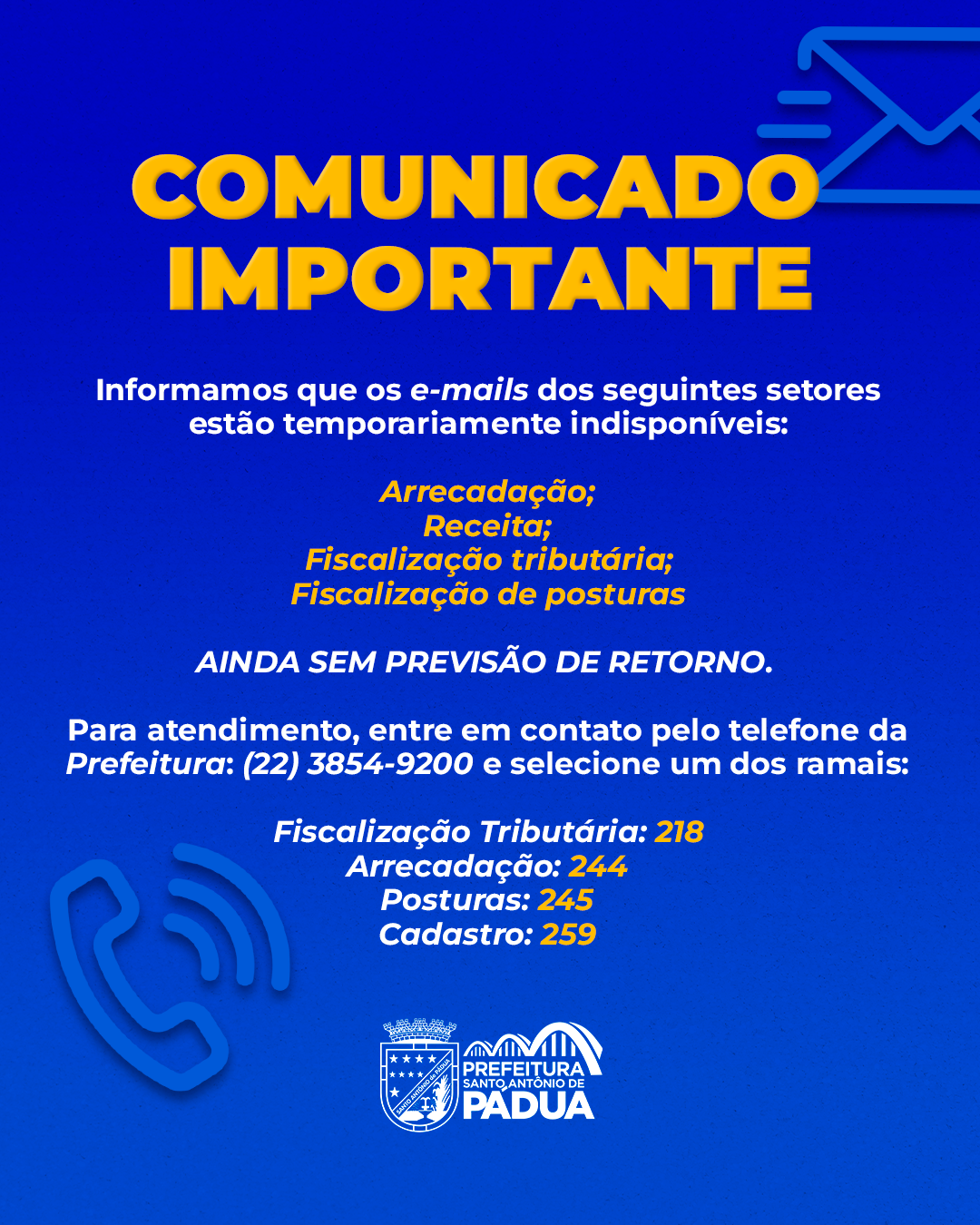 Comunicado importante Informamos que os e-mails dos seguintes setores estão temporariamente indisponíveis: ArrecadaçãoReceitaFiscalização TributáriaFiscalização de Posturas Ainda sem previsão de retorno Para atendimento, entre em contato com a Prefeitura pelo telefone: (22) 3854-9200 e selecione um dos seguintes rama
