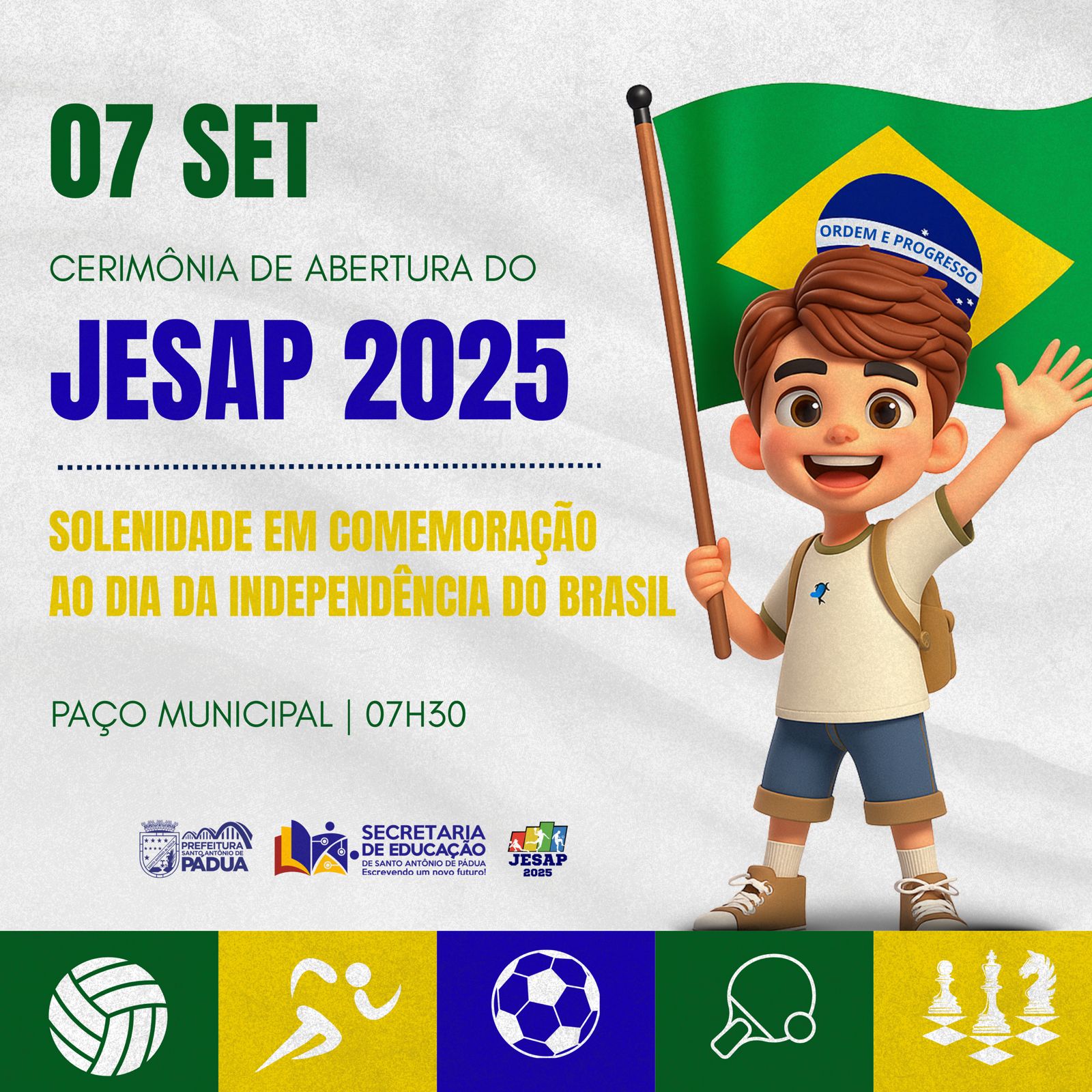 No próximo dia 07 de setembro, data em que o Brasil celebra sua Independência, Santo Antônio de Pádua dará início oficialmente à edição 2025 dos Jogos Escolares de Santo Antônio de Pádua (JESAP). A cerimônia de abertura acontecerá no Paço Municipal, a partir das 07h30, reunindo estudantes, professores, a