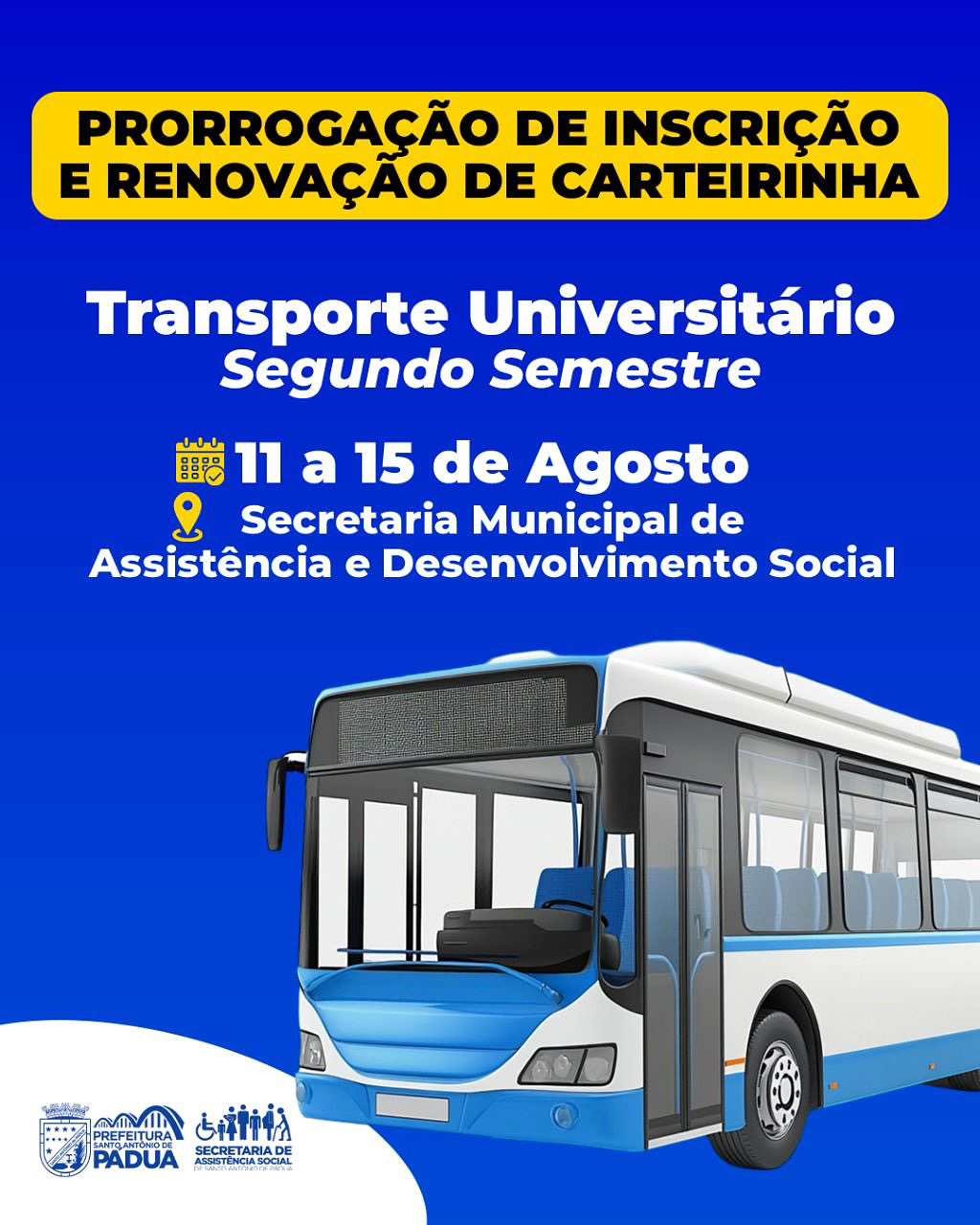 Prorrogação de Inscrição e Renovação de Carteirinha Atenção, universitários! As inscrições e renovações para o Transporte Universitário - 2º Semestre foram prorrogadas! De 11 a 15 de agosto, na Secretaria Municipal de Assistência e Desenvolvimento Social Não perca essa oportunidade! #secretariadeassistenciasocial#santoantoniodepádua