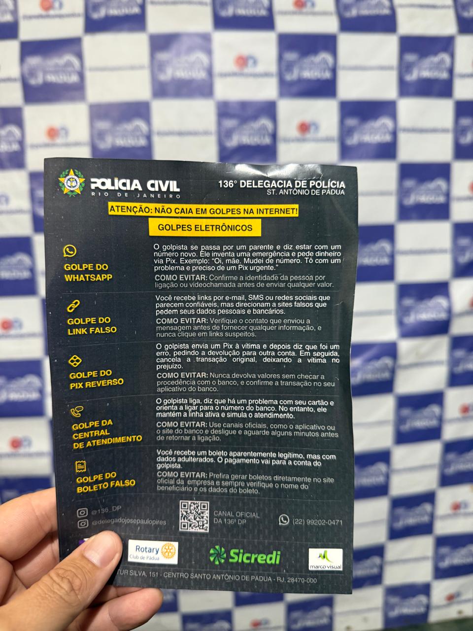 Agentes da polícia civil da 136°de Pádua em parceria com a Secretaria Municipal de Segurança Pública realizaram uma campanha de conscientização com a finalidade de informar sobre a importância em combater os “crimes virtuais”. Com a presença do delegado José Paulo Pires, a campanha intitulada “Atenção: Não caia em golpes da internet” os servidores entregaram um panfleto info