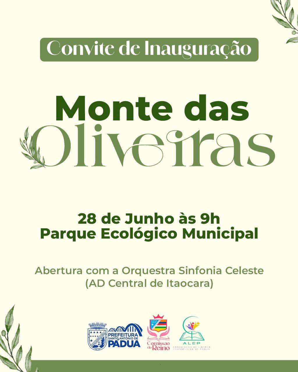 A PREFEITURA DE PÁDUA convida você para a inauguração dos Montes das Oliveiras no nosso Parque Ecológico Municipal! Sábado, 28 de Junho 09:00h Participação especial da Orquestra Sinfonia Celestial da Assembleia de Deus Central de Itaocara!