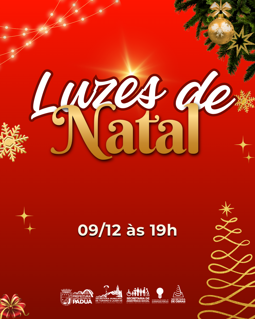 O clima natalino já começa a tomar conta de Santo Antônio de Pádua. No dia 09 de dezembro, às 19h, a Prefeitura realizará a abertura oficial do projeto "Luzes de Natal", que marcará o início das festividades de fim de ano no município. Com decoração iluminada, ambientes temáticos, o evento promete encantar famílias e visitantes, resgatando o espírito natalino e fortalecendo o sentim