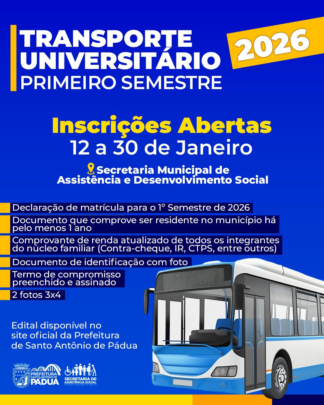 Estão abertas as inscrições para o Transporte Universitário referente ao primeiro semestre de 2026. Período: 12 a 30 de janeiroLocal: Secretaria Municipal de Assistência e Desenvolvimento Social Confira no card a lista de documentos necessários.O edital está disponível no site oficial da Prefeitura de Santo Antônio de Pá