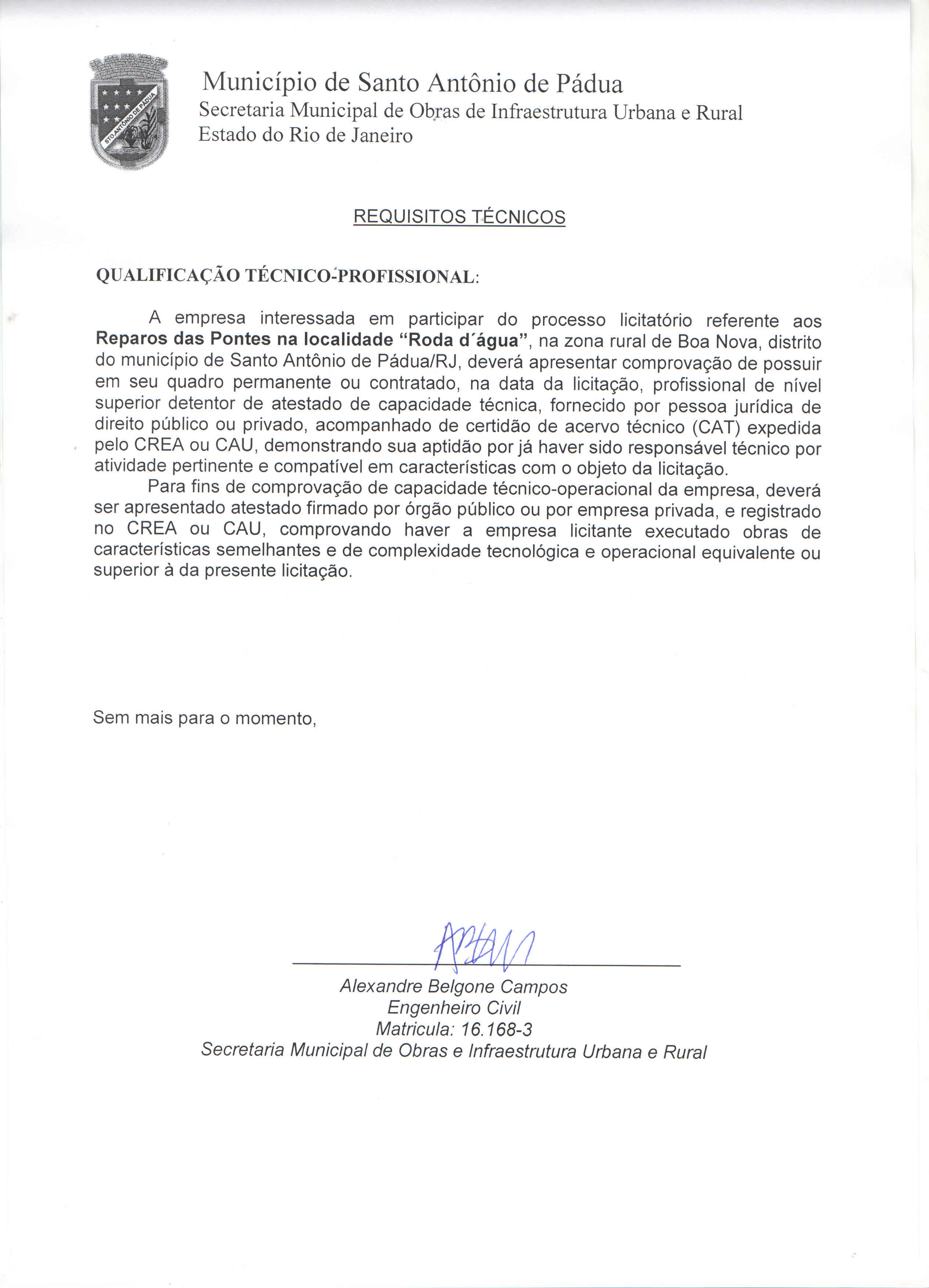 REPARO DE DUAS PONTES NA ZONA RURAL DE BOA NOVA, LOCALIDADE DENOMINADA RODA D’ÁGUA, NO MUNICÍPIO DE SANTO ANTÔNIO DE PÁDUA
